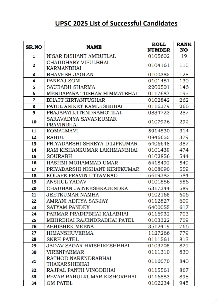 Ahmedabad, Gujarat, March 06, UPSC સિવિલ સર્વિસ પરીક્ષા 2025 માં ગુજરાતના કુલ 34 જેટલા તેજસ્વી દીકરા-દીકરીઓ ઉત્તીર્ણ થયા છે, રાજ્ય ના મુખ્યમંત્રી ભૂપેન્દ્ર પટેલએ હાર્દિક શુભકામના પાઠવી છે.